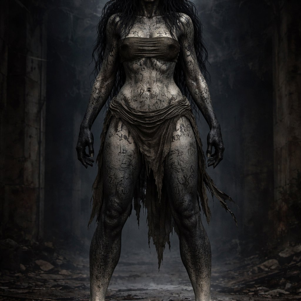 With a face a feet. Female. Height- 6 foot 8 inches tall. Black hair but length and straggly. Gray rock like skin specklie and sparkly. White irises. Music note and hieroglyphic scarification on chest, stomach, shoulders, arms, calves, and jawline. Raggedy dirty cloth like apparel- top bando and bottoms scarf like wrap. Shoeless. Dirty- charcoal covered- contrasting from the tips of the limbs and up the body.