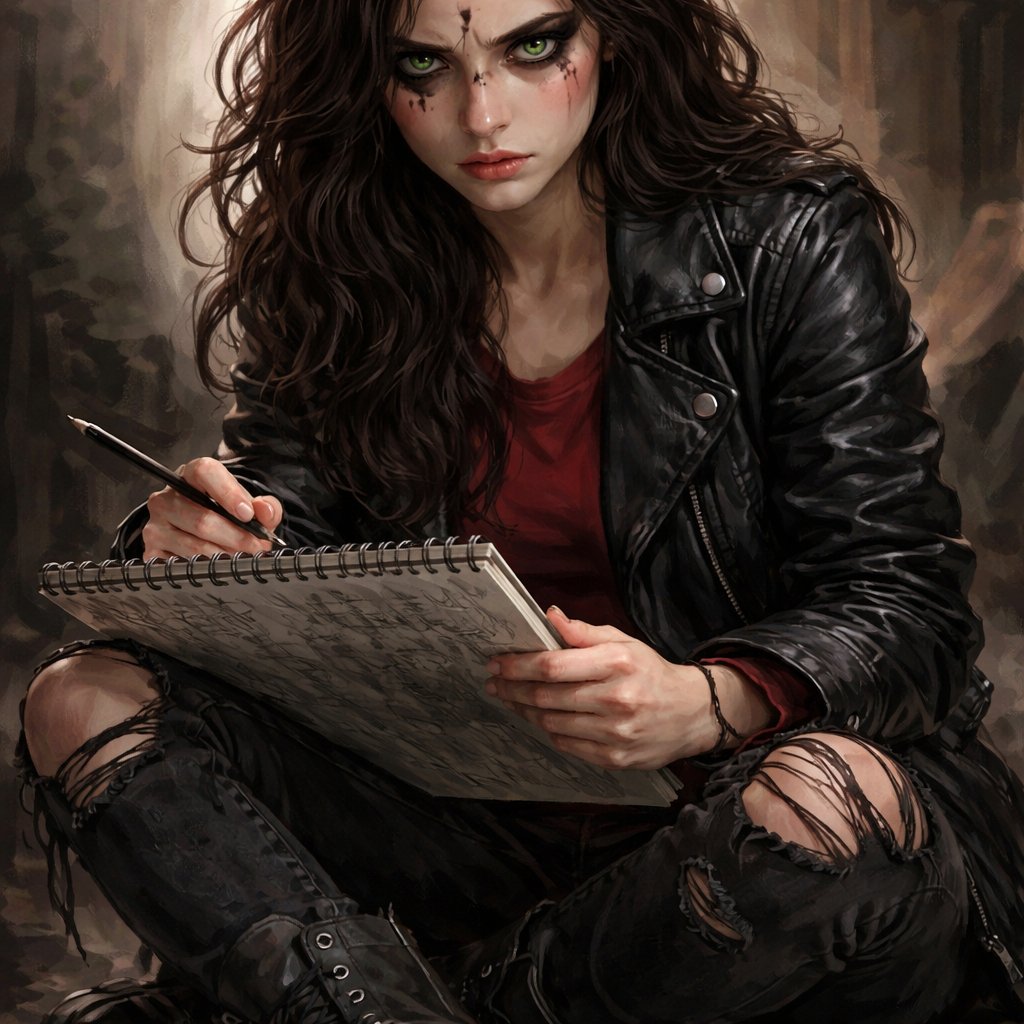 A female with intense green eyes, wavy dark brown hair and black eyeliner. She looks angry and sad. She holds a sketch pad and is looking directly at the viewer. She wears a black leather jacket, red T-shirt and ripped jeans with black combat boots.