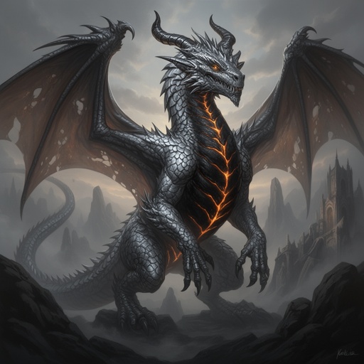 Dark Silver dragon. Wyvern. Molten bronze eyes. Black belly. Horned head.