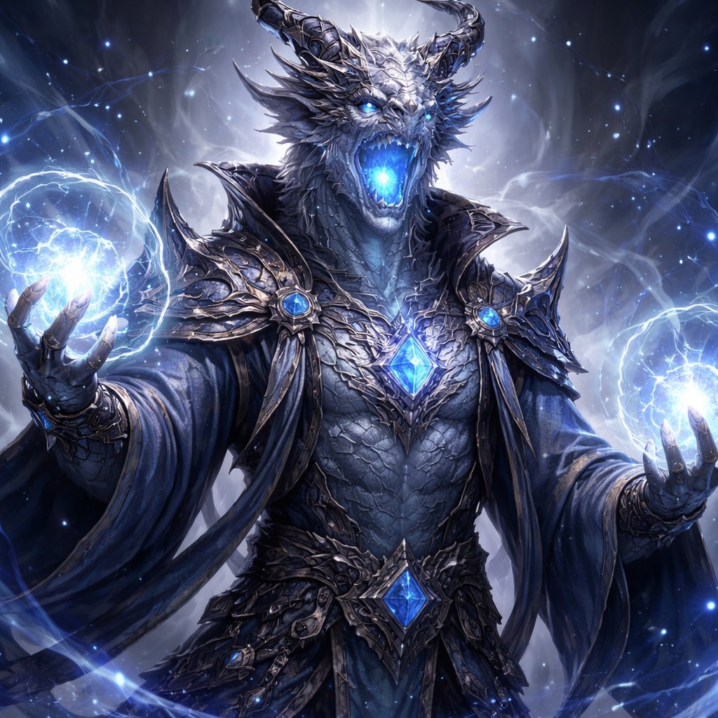 Silver Dragonborn sorcerer blue eyes radiating innate magic