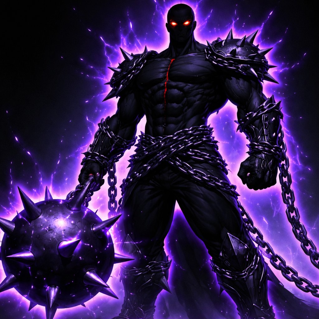 Buff, guy, pure black like the void looking like a smooth texture like marble but with no shine no nipples or weiner,pure red circle eyes with no mouth or ears or nose, he has a line that droops from his eyes straight down to the chin exactly stopping at the chin. He has a shoulder armour piece on is right arm that has a purple void-like outline on the black shoulder armour piece . He has a giant ball and chain . The chain has the same look as the shoulder piece with the purple outline and the armour look. The ball is made of the same as the armour piece too but each spike on the ball is made of the void purple stuff but on the ball it looks like purple plasma