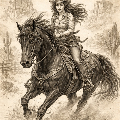 Cowgirl gunslinger with brown hair, black eyes riding big all black stallion with western background