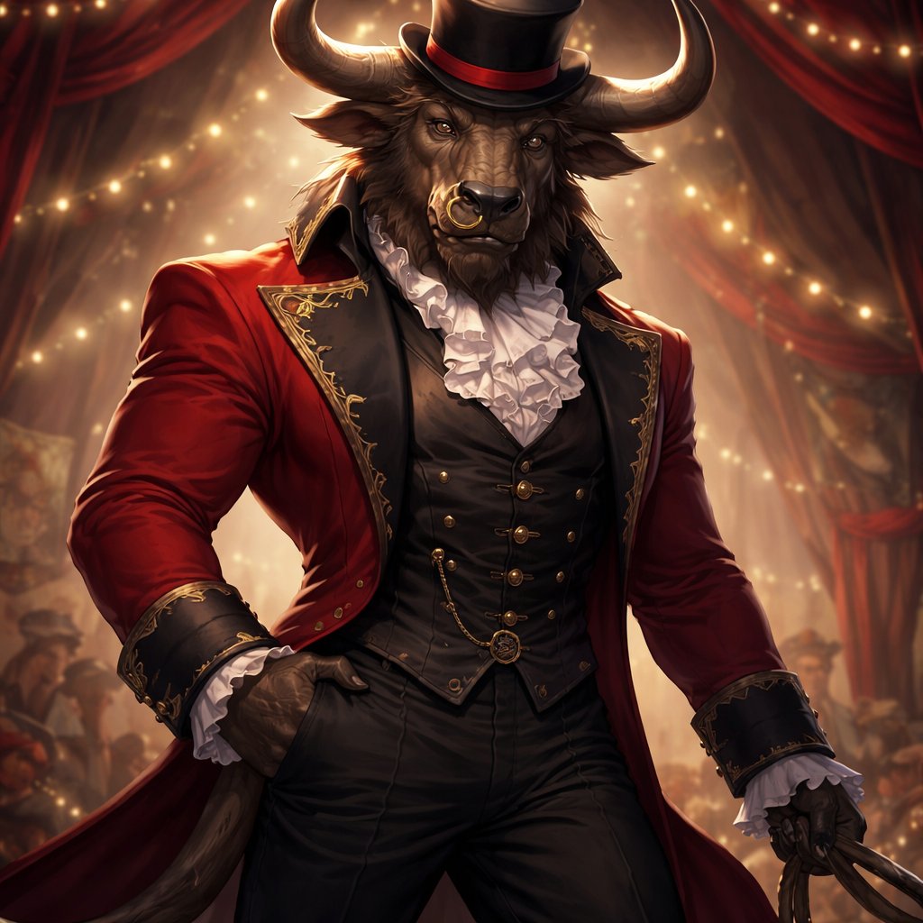 A male Minotaur that’s 6 1/2 feet tall. He had a humanoid-Cretan bull face with deep set bovine like brown eyes. On his Head were large powerful gleaming curved horns like his fathers. He has a well~proportioned figure/body and a long tail, with his skin/fur a captivating Taupe color. He works at freak show as the ringmaster. His outfit consists of a crimson tailcoat, frilly shirt, stunning blazer, pants and top hat. His abilities are Reality Rejection, Time Manipulation (Chronokineses), Zoolingualism (Language of Cattle only), Human Speech.