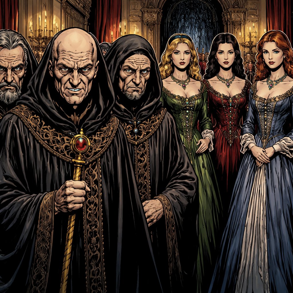 Realistic refined no caricature a group of unpleasant old people in robes are gathered in a palace gossiping