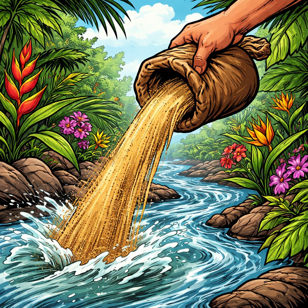 A hand holding a bag of sand pour it on the waters of a stream surrounded by plants and flowers. The scene is indigenous South American.