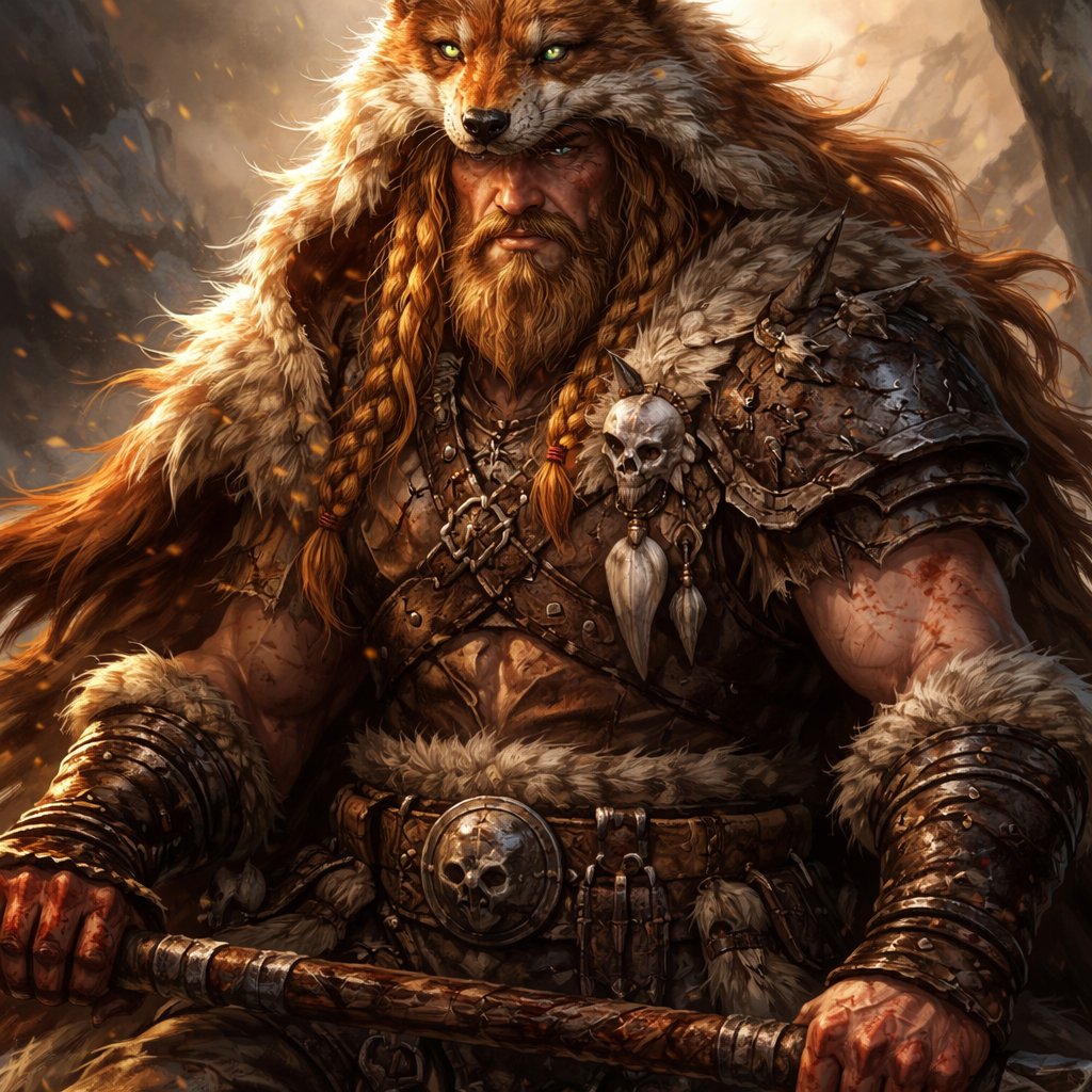 orangish blonde haired with thick beard barbarian man wearing fox pelt over his head and shoulders
