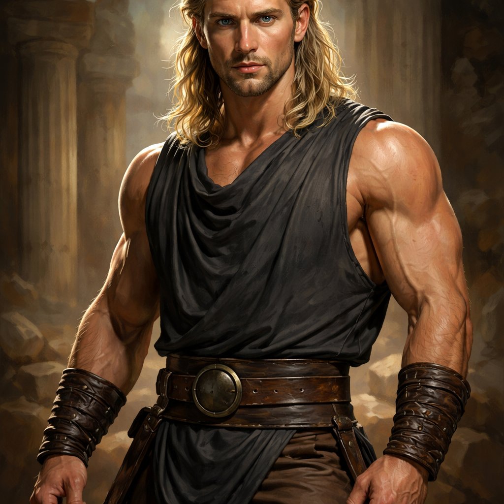 A tall well~proportioned male, so handsome he looks like a Greek god with muscles. With deep-set blue eyes and strong brows, hinting at inner depth“. His hairstyle is a blonde mullet. He works at freak show as a strong man. His outfit consistsed of a Charcoal-toned sleeveless Greek tunic, thick leather belt, leather wristbands/cuffs, brown pants.