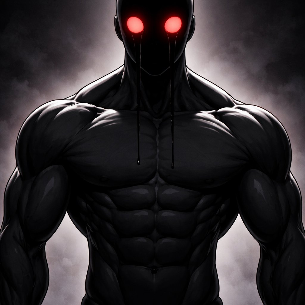 Buff, guy, pure black like the void,pure red circle eyes with no mouth or ears or nose, he has a line that droops from h...