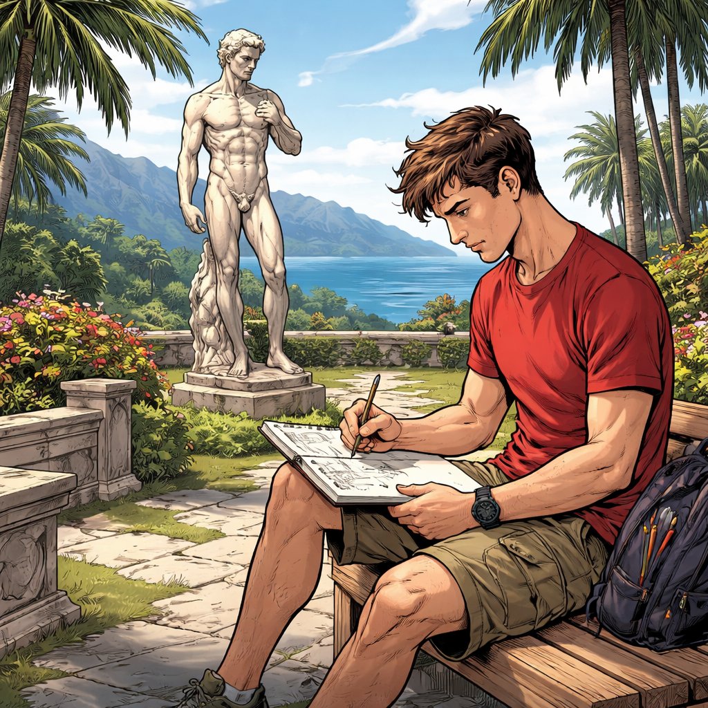 Refined realistic, no caricature no speech bubbles a young man it is early 20s is sitting with a drawing pad on a bench in the sculpture garden looking at a large male, naked sculpture, the garden overlooks mountains, palm trees, and the ocean