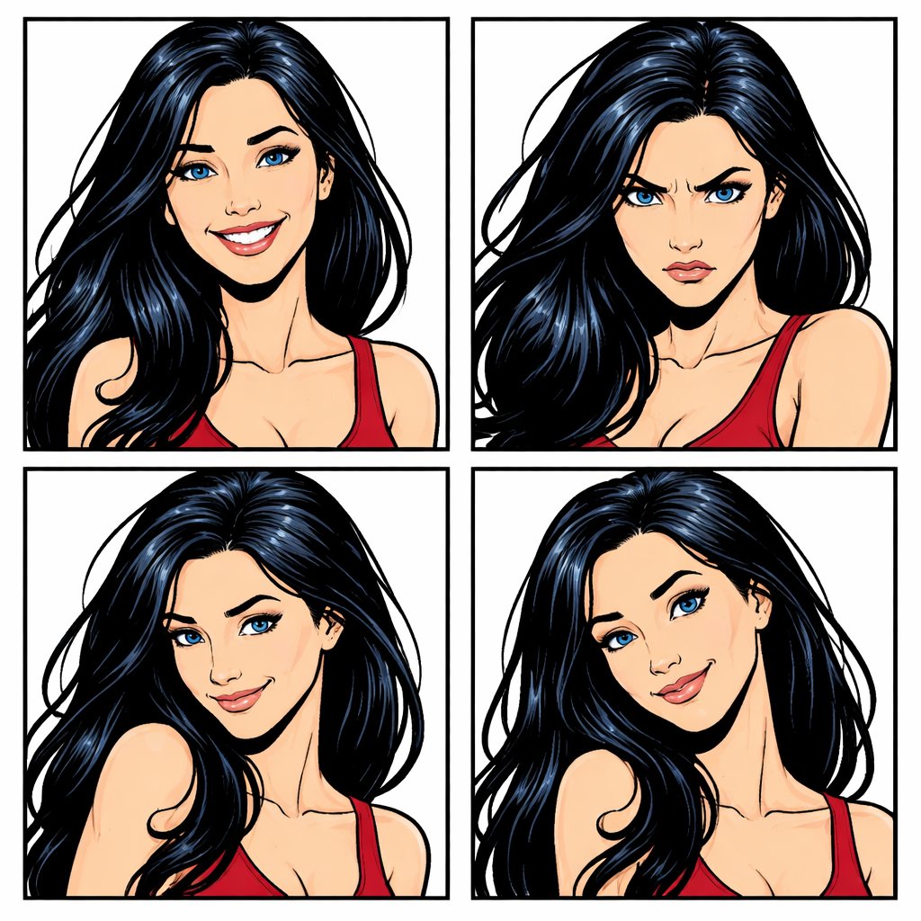 Four panels white background only no speech bubble, a stunning woman, long black lust, dress hair, sharp blue eyes but you’re looking for her young age, 4 different poses, smiling, angry, but not furious, sly and pleasant