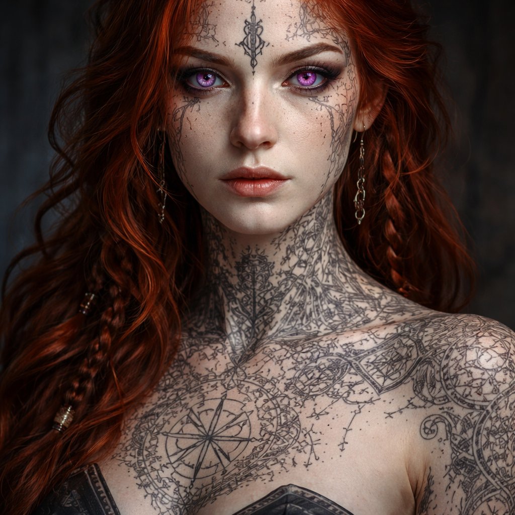 A red haired woman with pale skin, runic tattoos all over her body and face and amethyst eyes
