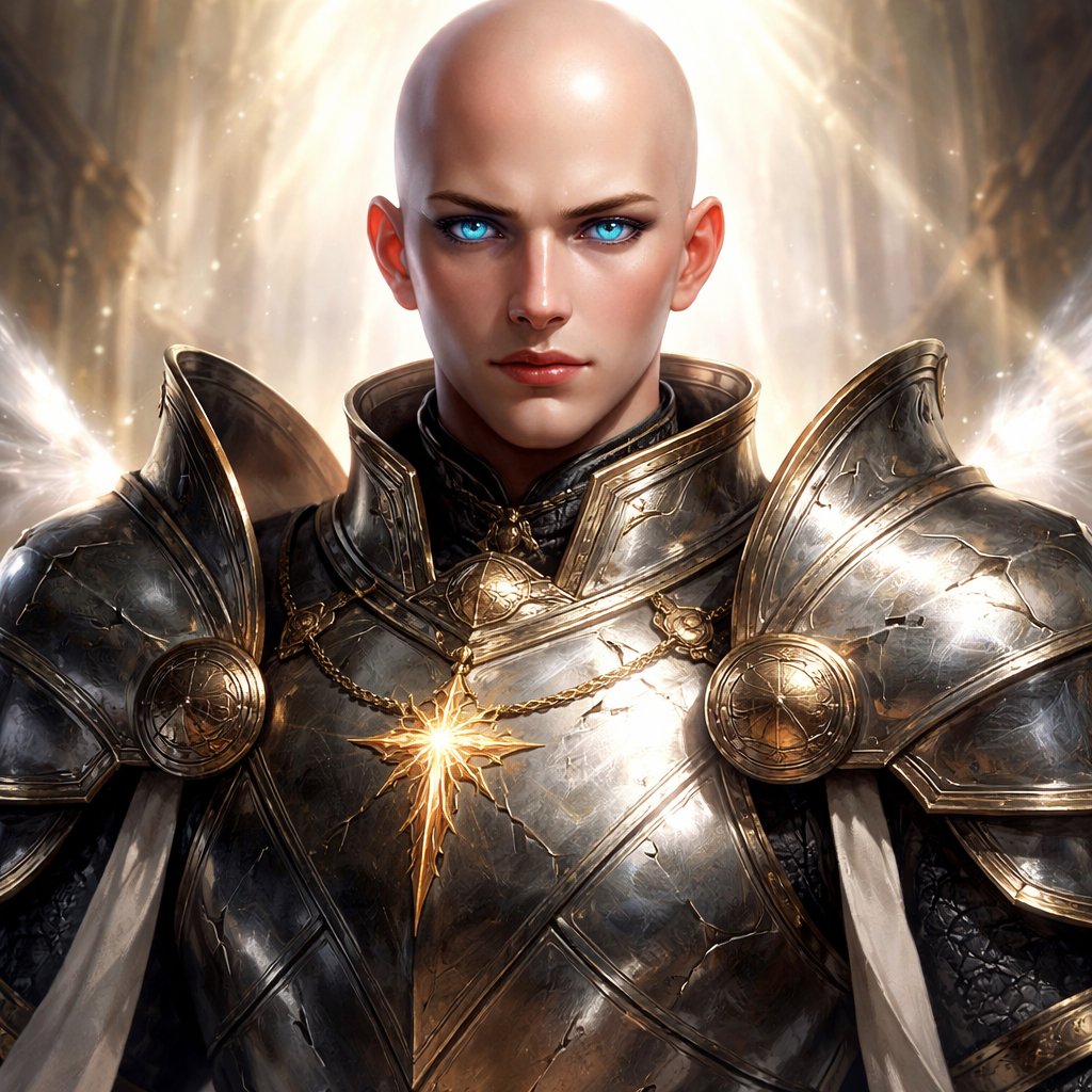 Blue eyed, fair skinned, shaved head, muscular Aasimar veteran Eldritch Knight. Wearing epic full plate armor with mag...