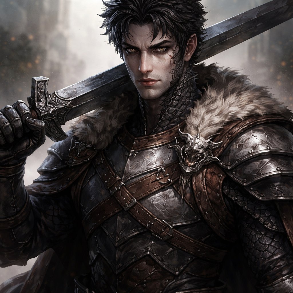 Male dragonborn fighter black eyes medium size black hair skin white 28years old