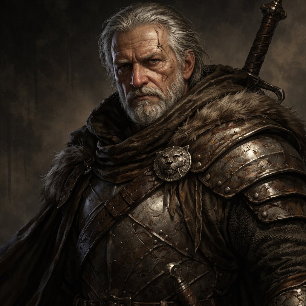 Time has not been gentle—but it has not broken him either. • Hair now fully gray, thinning at the top • A short, rough white beard—kept trimmed, not for pride, but habit • Face lined with age, scars, and years of watching others fall His eyes are what changed the most: • Once observant… now heavy with memory • Still sharp—but slower to judge, quicker to understand ⸻ His Presence Gerold no longer walks like a warrior eager for battle. He walks like a man who has seen enough of it. • Steps are measured • Shoulders slightly lowered—not weak, just carrying weight • Voice quieter… but when he speaks, people listen He doesn’t command attention. He earns it instantly.