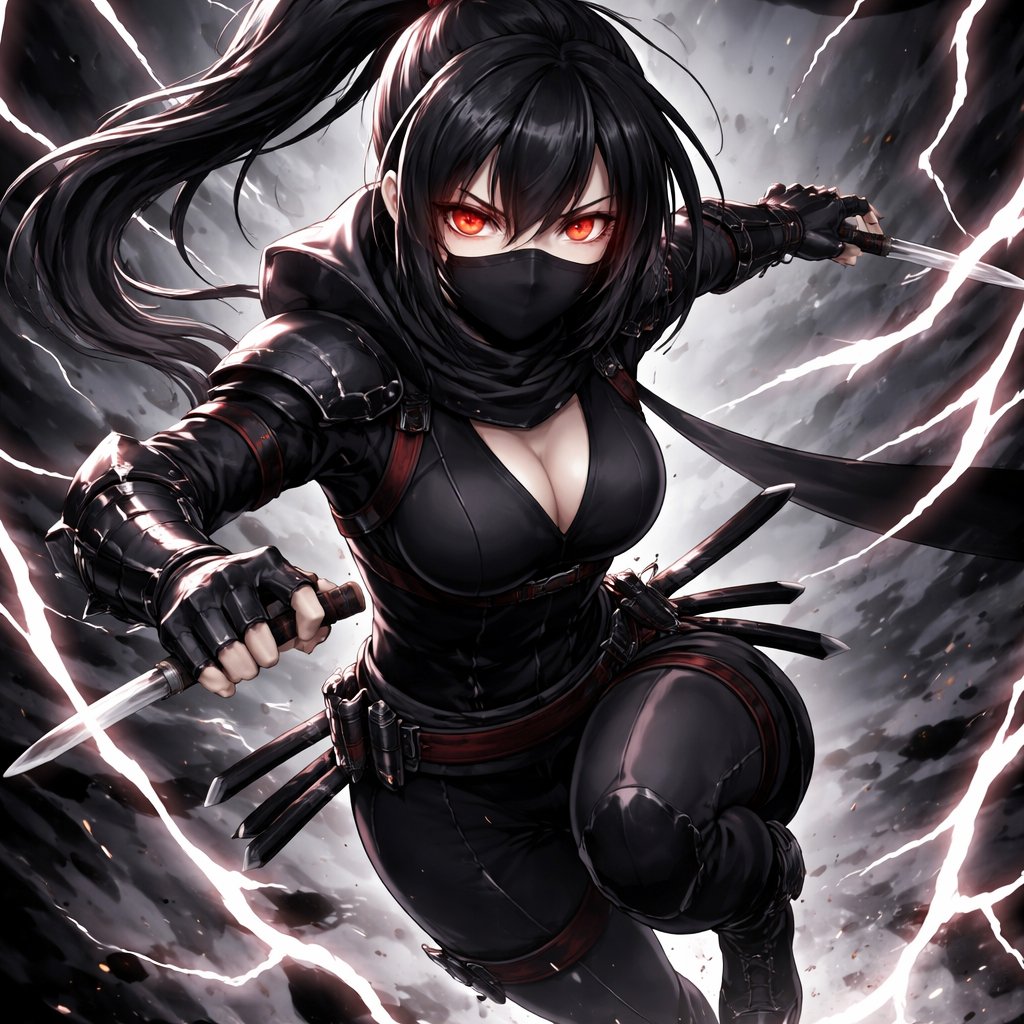 A adult Girl with a black ponytail wearing a high grade ninja outfit with black lightning