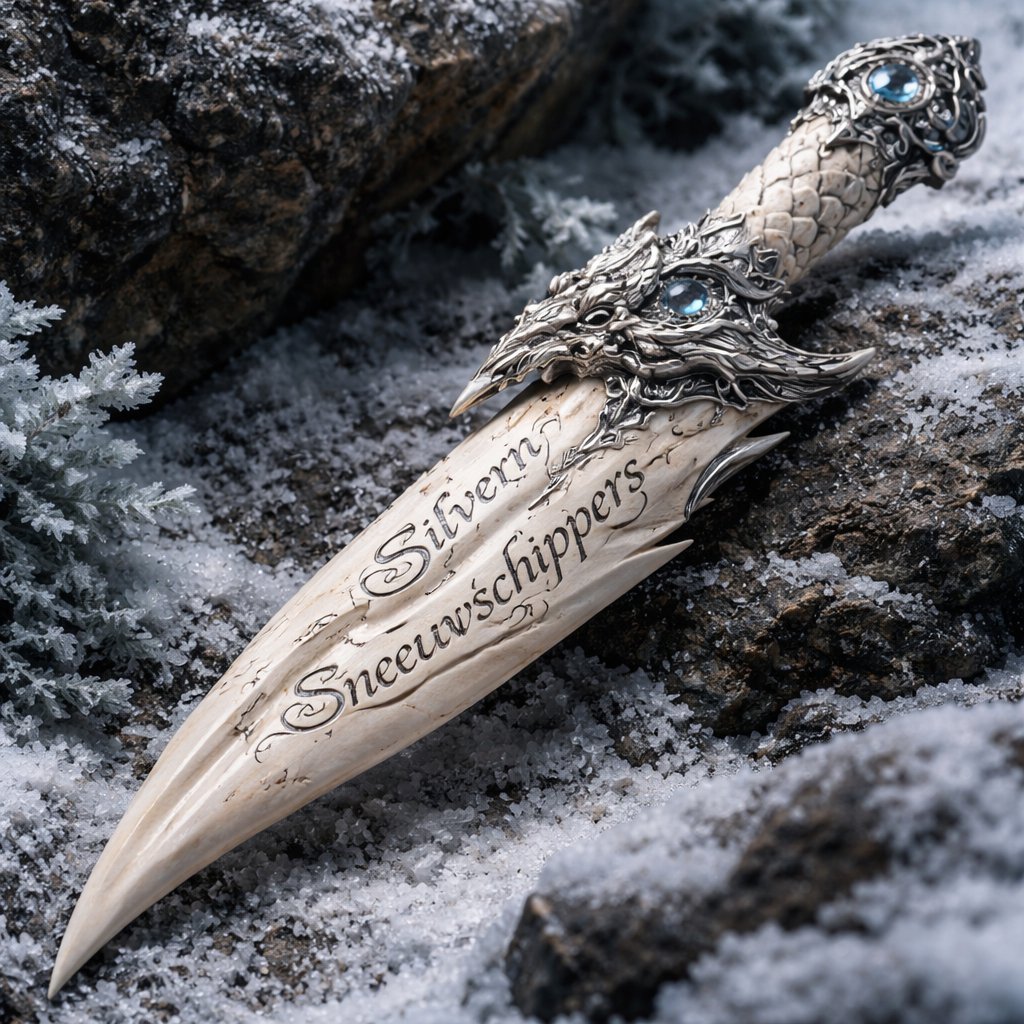 White dragon tooth dagger with the names silvern and sneeuwschippers carved in the dagger