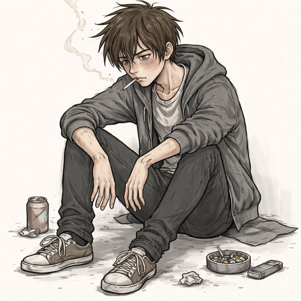 Feeling lonely, cigarette, depressed, looking down, gloomy in background, attractive older man, sitting on chair, suits