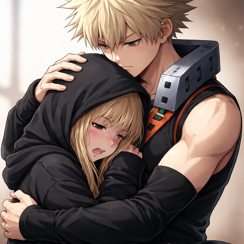 Bakugo hugging a teenage blonde girl sobbing into his shoulder with a black hoodie and the hood on her head