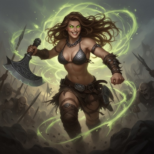 Female barbarian charging into battle with a confident grin. She wields a great axe and wears a chainmail bikini and lit...