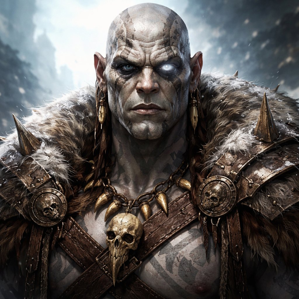 A goliath from dnd with light gray skin, the right eye is dark blue and the left is completely white almost fogged over