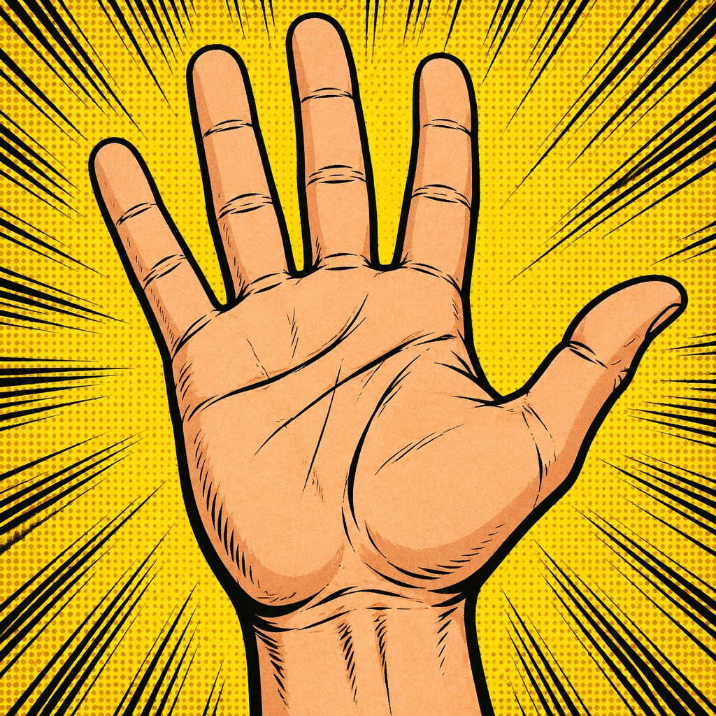 No caricatures, no speech bubble open palm, side view, flesh, color, right hand, heavy lines