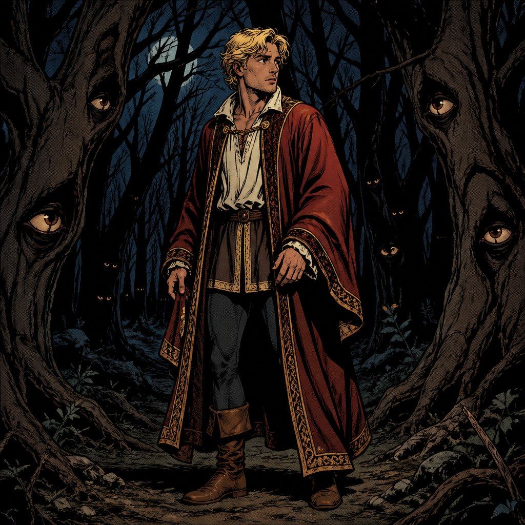No caricature, no speech bubbles realistic blonde young man in renaissance robe. Full head and body with stubble on his face and tousled yellow hair standing in a dark scary forest. Eyes are seen in the trees. Dark night mysterious