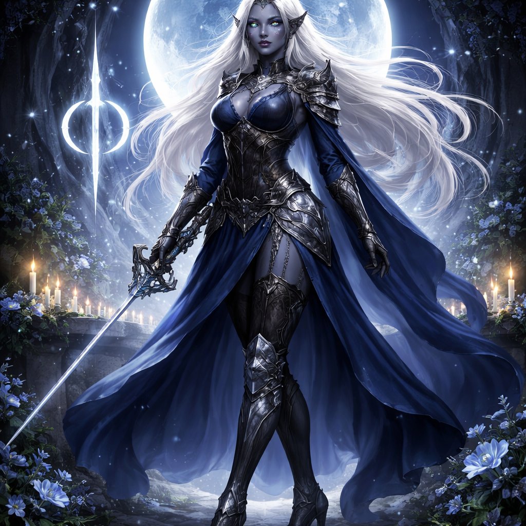 A beautiful Drow woman with long flowing white hair, dark grayish blue skin, large silver eyes, wearing dark blue flowing robes with armor plates, knee high heeled armor boots with Eilistraee’s symbol surrounding her. Carrying a long detailed rapier. Full body picture