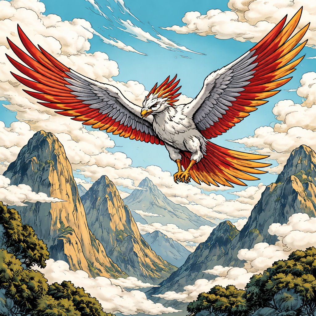 No caricature, no speech bubbles, an oriental style drawing of a bird flying above the mountains