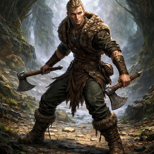 Young male short blond braided top knot/man bun wearing a tunic/norse shirt with authentic cut leg lacing pants, leather...
