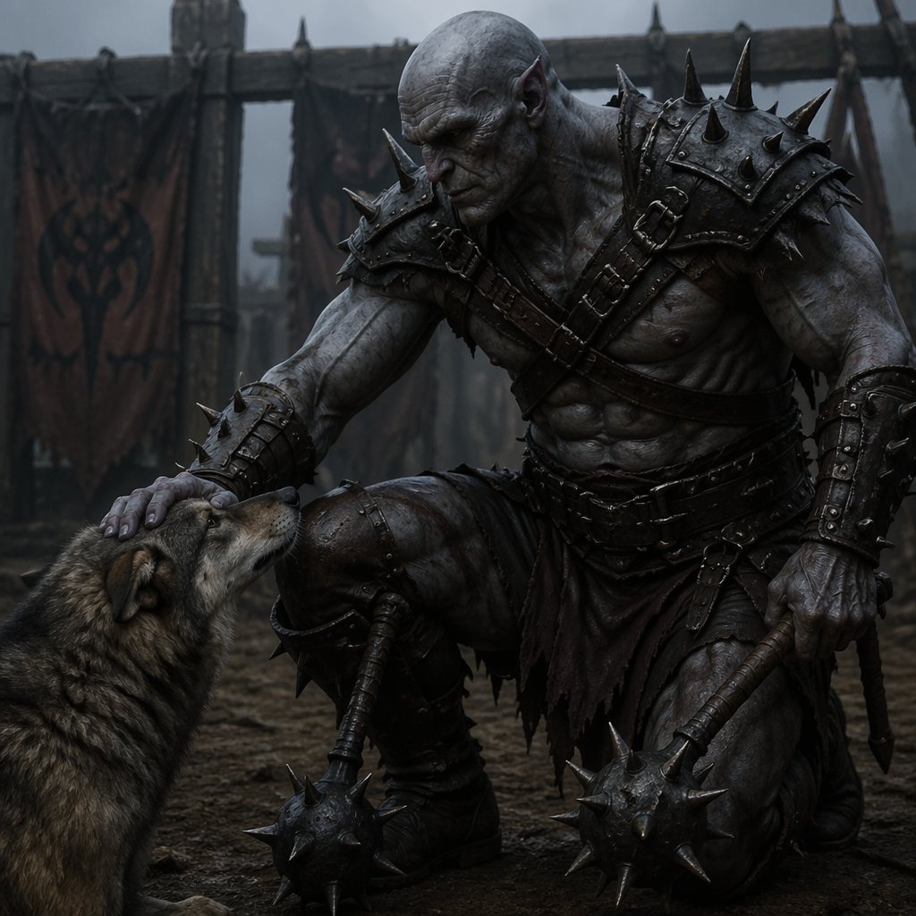 Ogre grey skin bald head spike leather armour holding two maces with spikes
