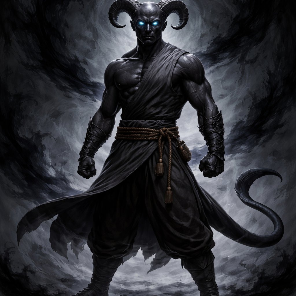 Bald, blue eyed, Rams horned, Muscular, Abyssal Tiefling, Monk, Warrior of Shadow