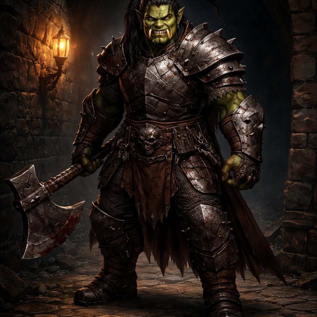 One eyed Half Orc noble background, Wearing heavy armor