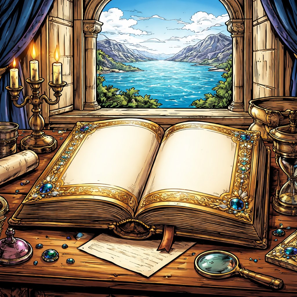 Ornate jewelled book in the Renaissance style it is open no illustrations and no text in the book. The box sits on a desk with a large window overlooking the sea and the mountains.