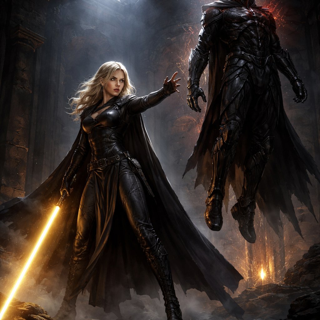 A full body picture of a female blonde Jedi in a black combat outfit holding a yellow lightsaber dueling a tall black si...