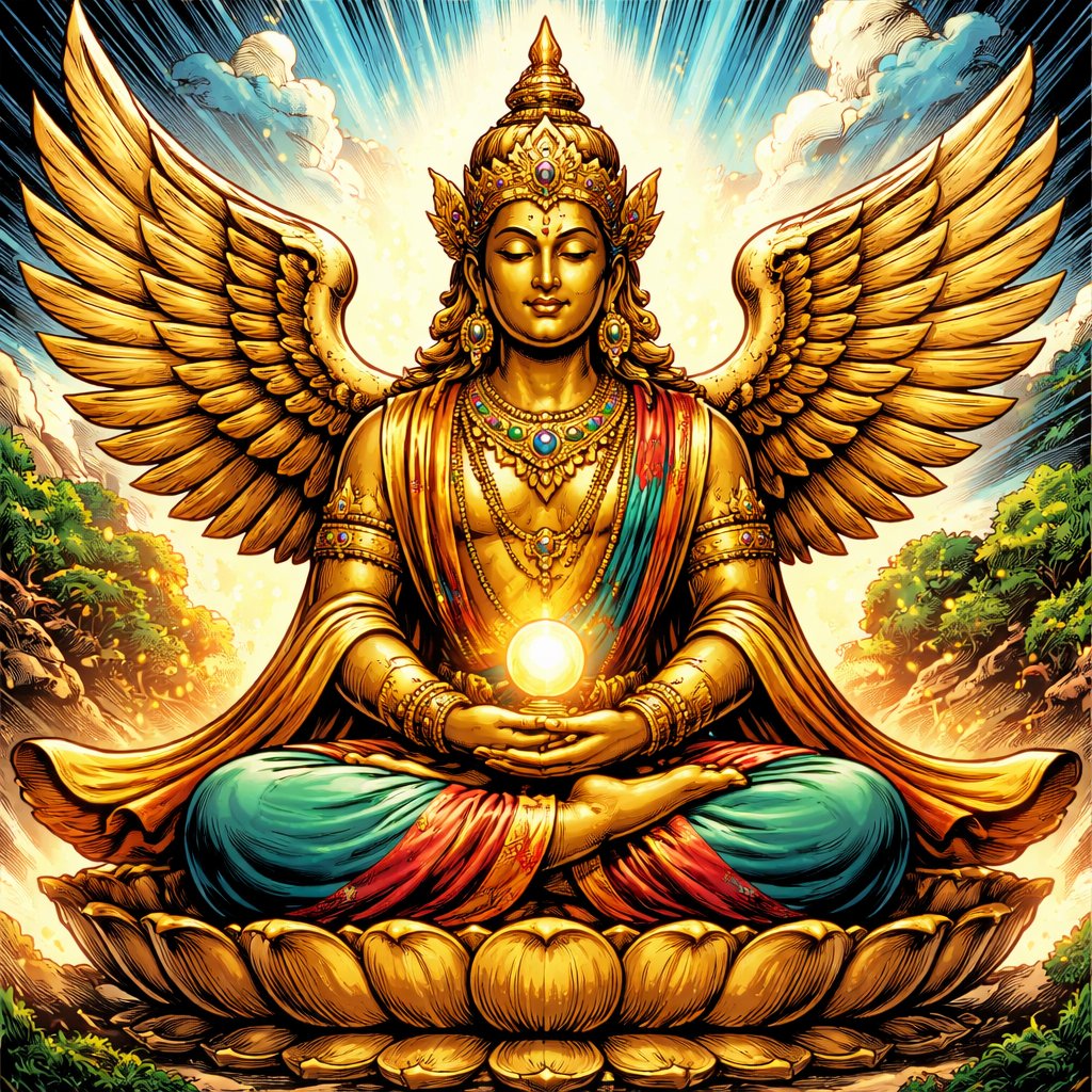 Long shot .A gold statue of an indigenous, Indian style character with golden wings in a robe in a Buddhist meditation position