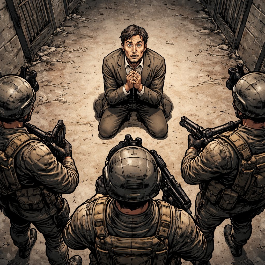 Refined realistic, no caricature four soldiers are standing in a straight line in front of a man who is not a soldier he is subservient to them. Drone view from the POV of the soldiers.