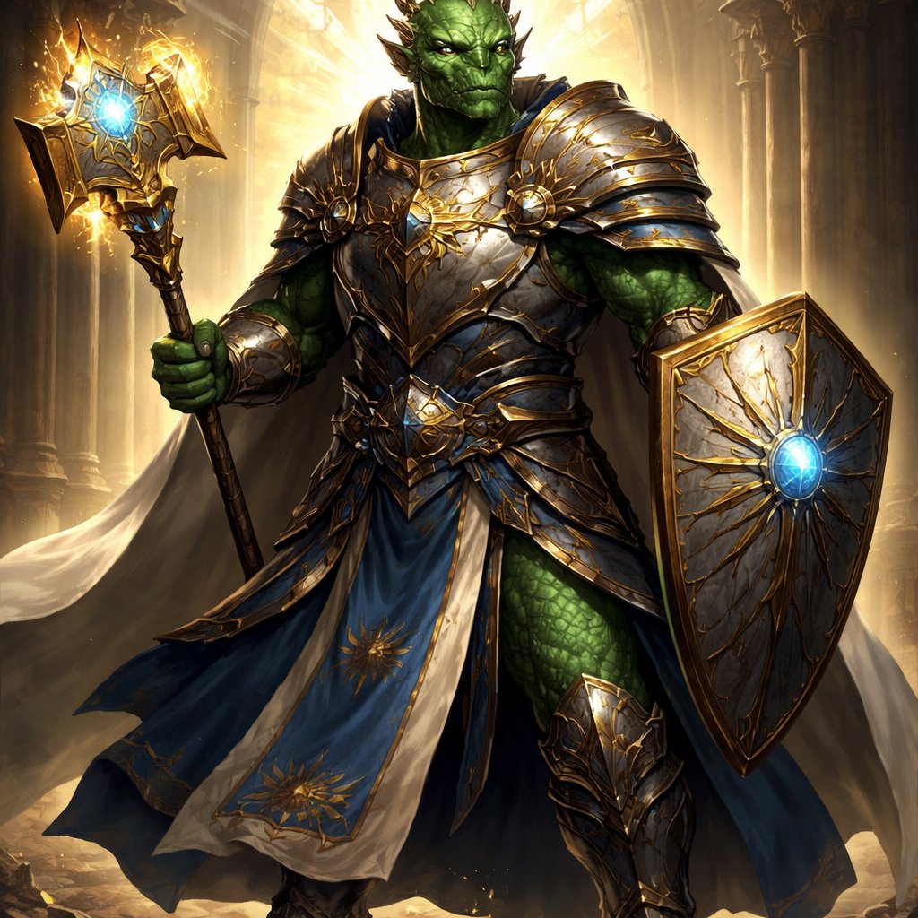 Green Dragonborn dorsal sail, bald, blue eyed, Cleric, fanged maw, Warpreist