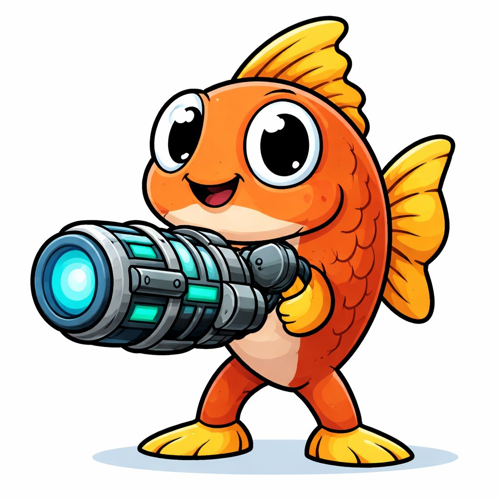 Can you create me an orange fish that has a cyber canon on one of his arms and can he be able to stand on two legs