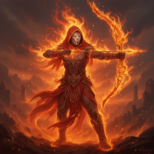 A hooded flame archer with a bow made out of fire and mask covering face