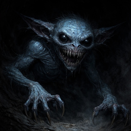 A blue goblin that has big black eyes. The goblin has big sharp teeth.