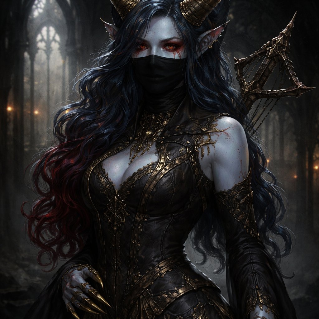 Tiefling golden with fine red line smudge eyes.Light blue-grey skin tone.Blue with red ends wave hair.2m height .Aperrence of a young adult indeterminate age.Black/grey/brown with small golden details vests not sure if it’s Nobel or assassin.Girl. With a golden metallic sharp nail tip and a Crossbow on the back .Hide mouth .Girl