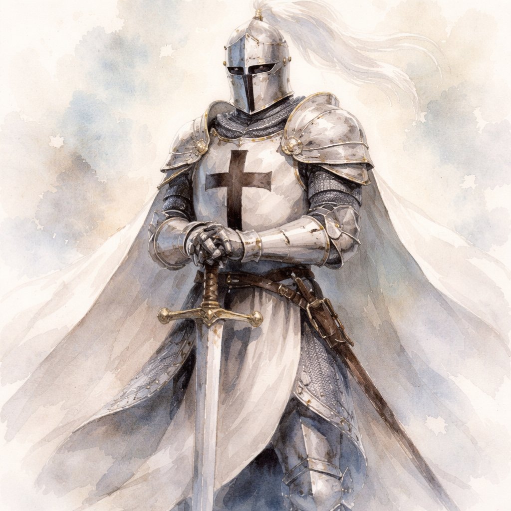 A knight with white armour, a black cross on the armour