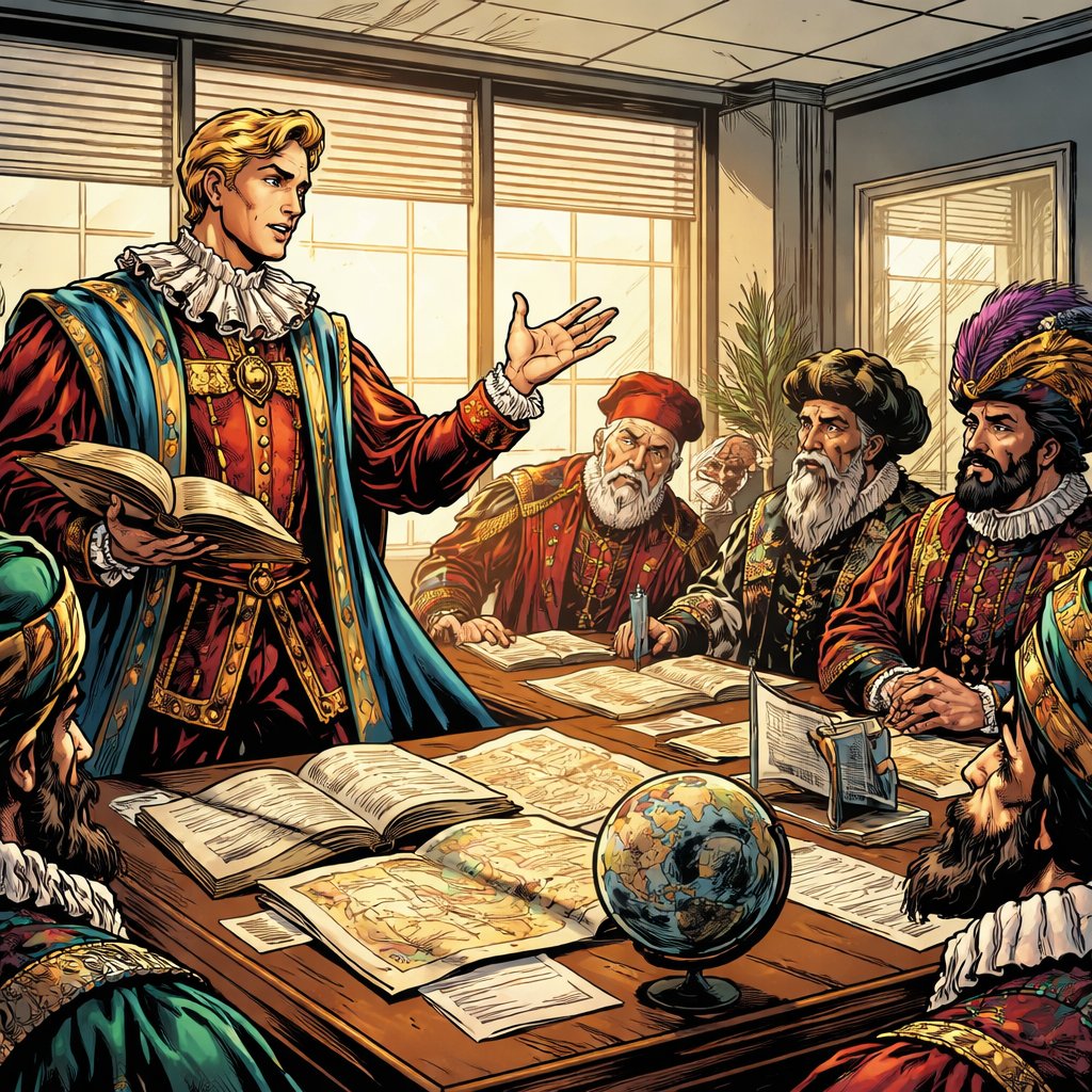 Realistic refined no caracature no speech bubble. A slim blonde man in renaissance robes is lecturing several ambassador...