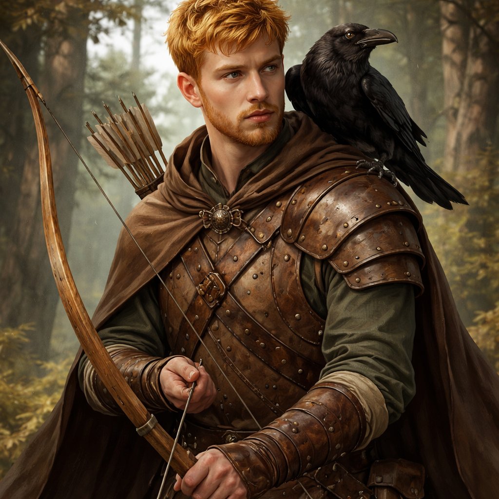 A male midevil soldier in light leather armor and short orange hair and a bow in his hand and a crow on his shoulder
