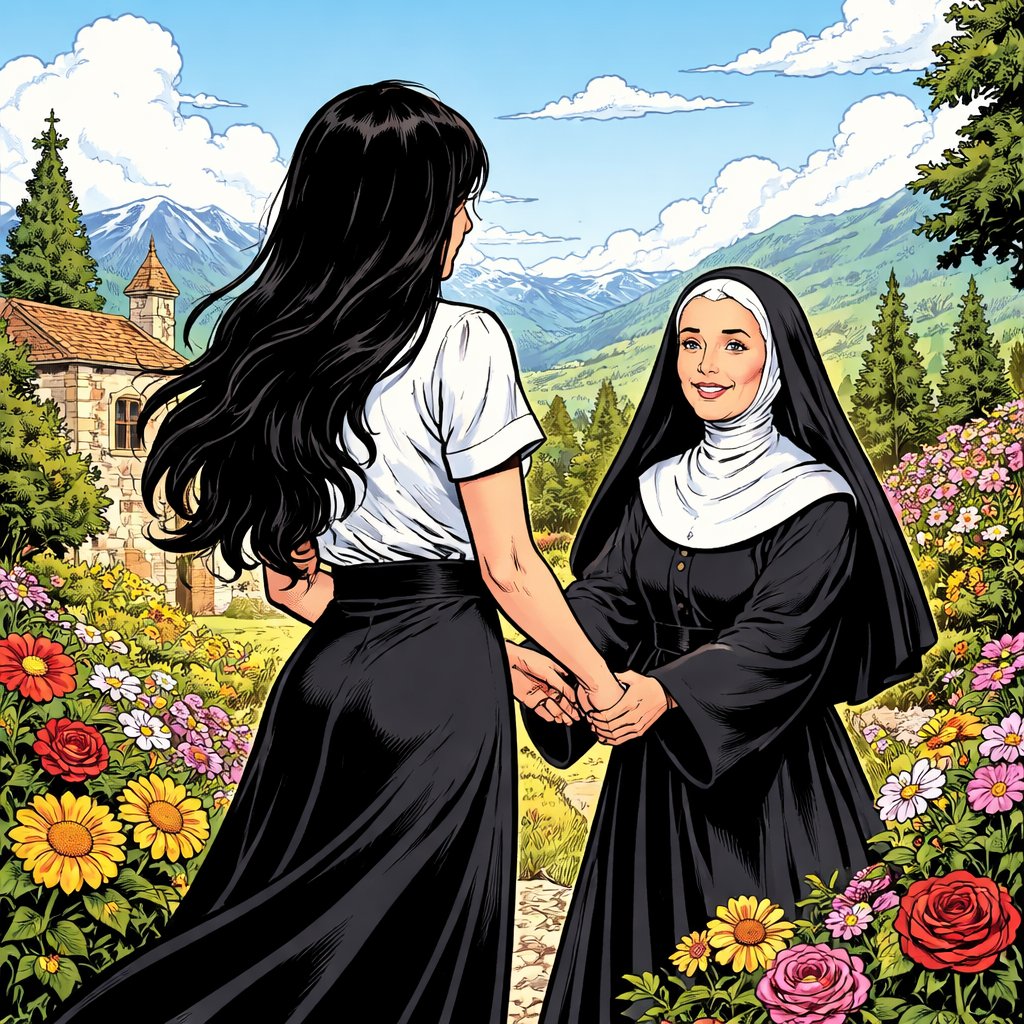 Atall young woman with long black hair rear view in a nunnery is holding the hand of a nun. the nunnery is surrounded by colourful flowers and lovely mountains in the distance. bright day