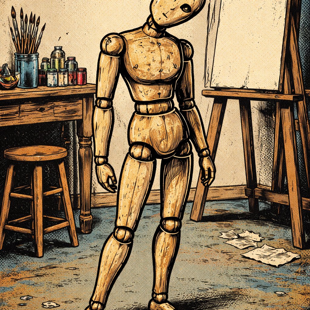 No caricature no speech bubbles. A older, time worn artist model is standing in a studio. Her head is tilted . three-qua...