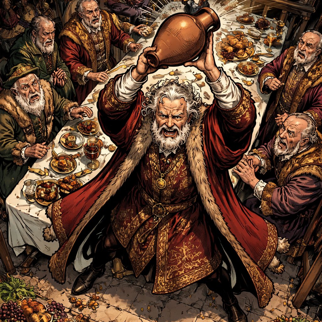 No caricature no speech bubbles an old man in Renaissance. Rose is standing on top of a table about to throw a jug of wi...