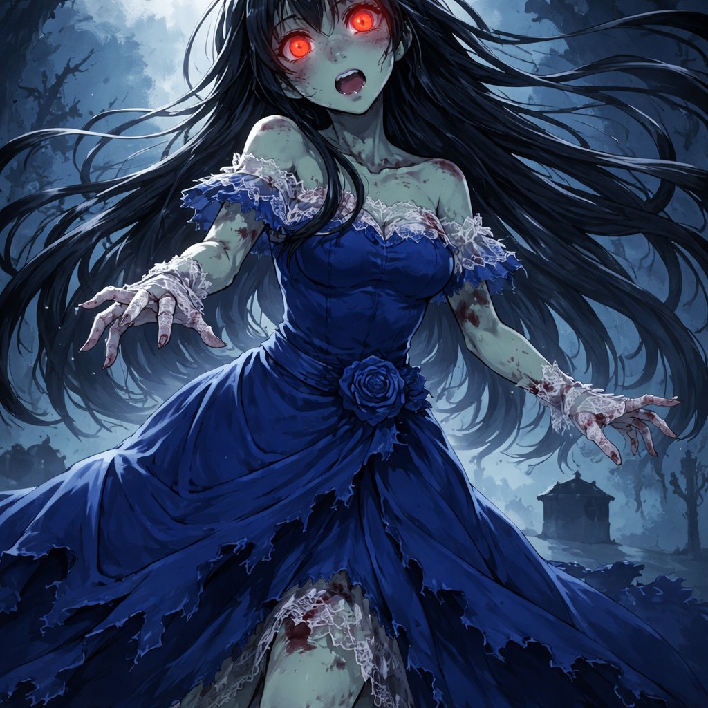Create an zombie anime girl in elegant attire