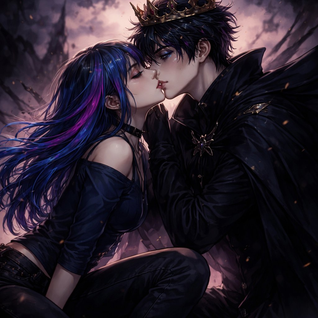 A 17 year girl who has blue hair with pink and purple stripes and has hazel eyes. She is wearing a blue shirt and black pants. Next to her is an 18 year old prince who has black hair with purple stripes and blue eyes. He is wearing a golden crown. He is also wearing all black and a cape. They are kissing.