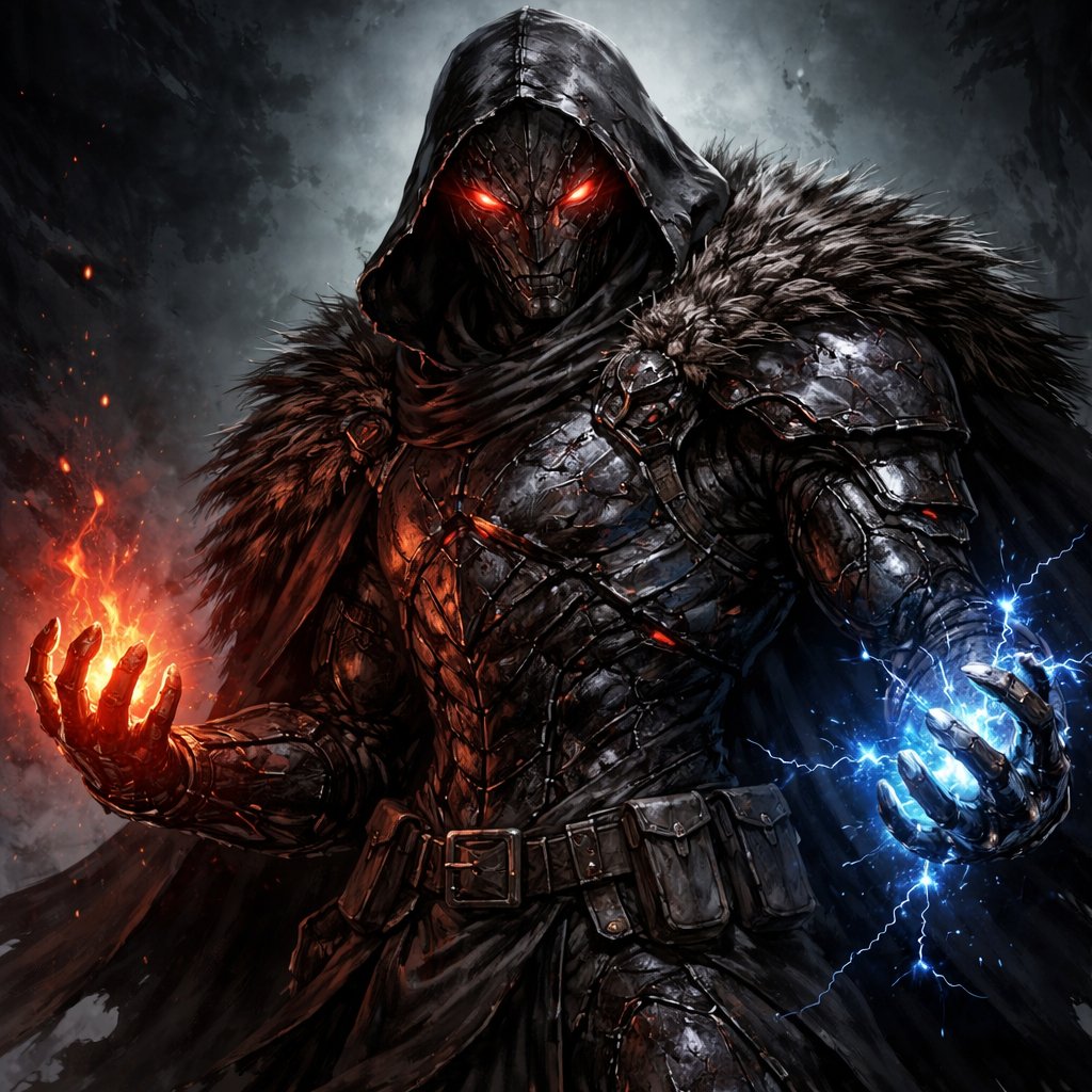 A war forged from dnd with dark metal skin that’s streaked, wearing a fur cloak with a black cloth hood which is up. With red glowing eyes like LEDs and the ends of one hand is glowing red hot and the other sparking with electricity